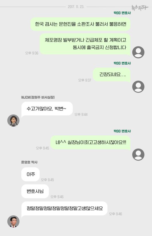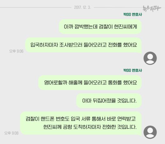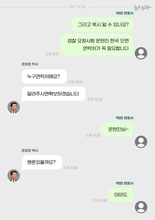 뉴스타파가 입수한 통일교 핵심 고위 간부와 통일교 측 국제변호인 박 모 씨의 단체 메신저 대화 내역에 따르면, 박 씨는 2017년 윤영호·정원주 등 당시 통일교의 핵심 고위 간부들에게 문현진 씨에 대한 서울동부지방검찰청의 출국 금지와 소환 통지가 임박했다고 알렸다.