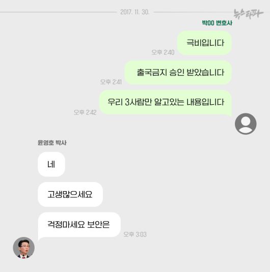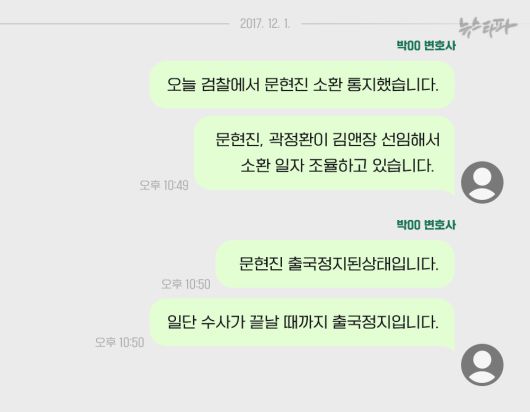 일주일 뒤인 2017년 11월 30일. 박 씨는 “극비입니다”, “우리 세 사람만 알고 있는 내용입니다”라고 강조하며 문현진 씨 출국금지가 승인됐다고 알렸다.
