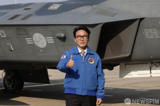 [서울=뉴스핌]김민석 국무총리는 7일 경남 사천 한국항공우주산업(KAI)을 방문해, 생산이 완료된 KF-21 보라매 전투기앞에서 엄지를 들어 보이고 있다. [사진=총리실] 2026.01.07 photo@newspim.com