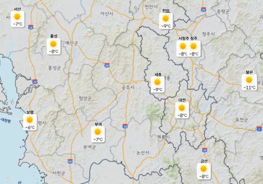 이날 아침 최저기온은 -9도 안팎까지 떨어지겠고 낮 최고기온은 대전·천안 -1도, 세종 0도, 청주 1도로 예보됐으나 체감온도는 4도가량 더 낮아 종일 영하권 추위가 예상된다.