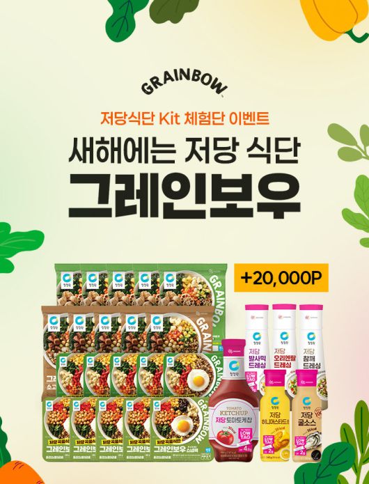 그레인보우를 직접 체험해볼 수 있는 ‘저당 식단 키트 체험단’ 이벤트도 운영한다. 체험 키트에는 그레인보우 파우치형, 용기형 총 20개와 저당 토마토케찹, 저당 드레싱 등으로 구성된 청정원 LOWTAG(로우태그) 저당 소스 5종이 포함된다.