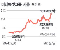 미래에셋그룹 시가총액이 1년여 만에 세 배 넘게 증가한 것으로 나타났다. 스페이스X 투자 성과를 축으로 자산가치 재평가를 받은 데다 국내 증시 활황에 따른 실적 개선이 동시에 진행되며 핵심 계열사인 미래에셋증권(006800) 주가가 급등한 결과다.