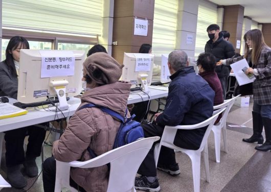 7일 옥천군에 따르면 군은 이날 농어촌기본소득 신청 접수를 본격적으로 시작했다. 옥천읍행정복지센터에는 이른 아침부터 수백 명의 주민이 몰려 북새통을 이뤘다.