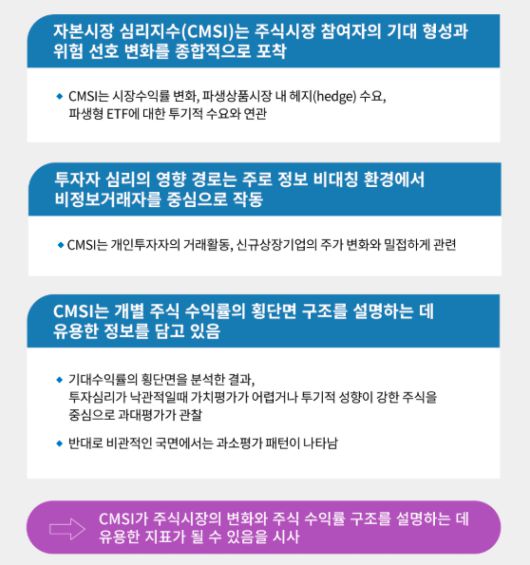 자본연이 CMSI를 활용해 국내 증시를 시계열적으로 분석한 결과 투자자 심리의 변동이 단기적으로 시장 수익률에 대한 예측력을 갖는다는 점이 실증됐다. 예를 들어 CMSI가 높을수록 신규 상장 기업의 평균 초과수익률이 증가했다. 또 해외 주식시장 심리지수, 국내 주식시장 수익률, 주식 파생상품시장에서 나타나는 투자자 공포와 헤지 수요, 파생형 상장지수펀드(ETF) 등에 대한 투기적 수요와도 유의미하게 연동돼 위험 선호 변화를 종합적으로 포착할 수 있었다.