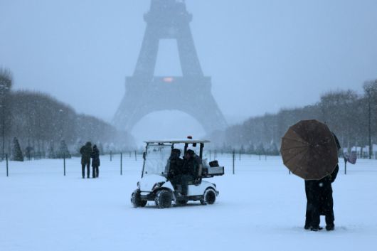 7일(현지시간) 폭설이 내린 프랑스 에펠탑 앞을 시민들이 지나고 있다./AFP 연합 |
