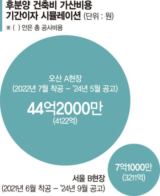 업계 시뮬레이션 결과 840여가구 규모의 경기 오산의 A 아파트 현장은 후분양 공사비 기간이자 비용이 44억2000만원에 이르는 것으로 조사됐다. 이 단지는 지난 2022년 7월에 착공해 2024년 5월에 모집공고를 냈다. 지난 2021년 6월에 착공해 2024년 9월에 공급된 서울의 B 재건축 단지의 경우 후분양 공사비 기간이자 비용이 7억1000만원 가량으로 추산됐다.