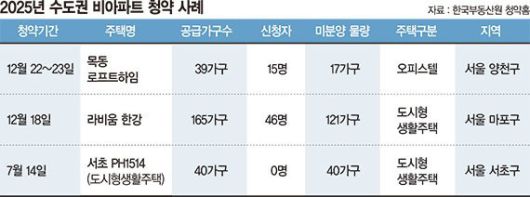같은 달 18일 접수를 받은 '라비움 한강'(도시형생활주택)에서는 40~57㎡ 총 165가구가 공급됐지만 접수는 46명에 그쳤다. 가장 큰 규모인 57㎡에서만 경쟁률이 1.13대 1을 기록했으며, 나머지 121가구가 주인을 찾지 못했다. 이 주택은 마포구 합정역 초역세권에 한강조망이 가능하다. 강남3구 중 서초구 서초동에 공급되는 고급형 도시형생활주택 '서초 PH1514'는 40가구 청약에 단 한 건의 접수도 이뤄지지 않은 이례적인 일이 발생하기도 했다.