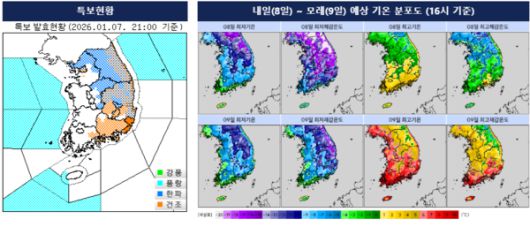 한편, 북서쪽 찬 공기의 영향으로 내일 전국 내륙을 중심으로 아침 최저기온이 -14도~ -2도까지 떨어지겠다. 특히 중부내륙과 전북동부, 경북내륙 지역 기온은 -10도 안팎, 강원내륙·산지는 -15도 안팎까지 떨어질 것으로 보인다. 수도권, 강원도, 충북, 경북권 등에서는 오늘 밤 9시부터 한파특보가 발효됐다. 낮 최고기온도 -3도~5도로 오르는 데 그쳐 중부내륙 아래쪽 일부 지역은 종일 0도 이하의 기온이 이어질 전망이다.