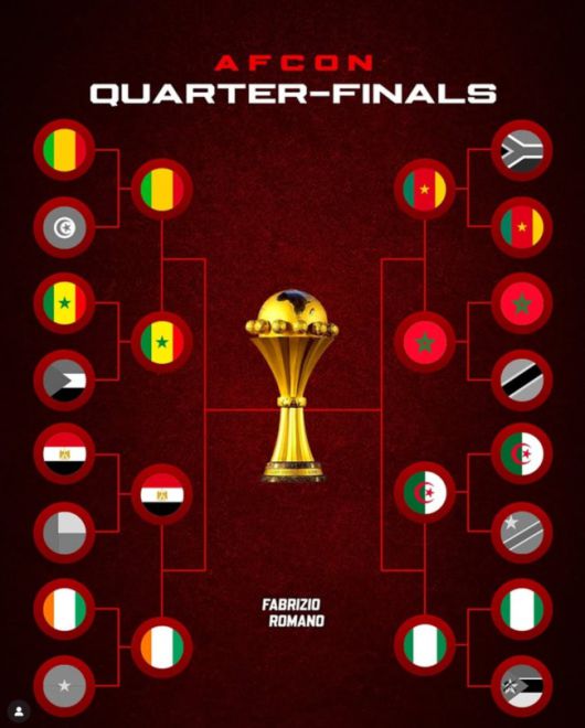아프리카 네이션스컵 8강 대진이 확정됐다. 이집트와 코트디부아르가 만나고 카메룬과 모로코가 맞대결을 펼친다. 나이지리아와 알제리, 말리와 세네갈도 맞붙는다.