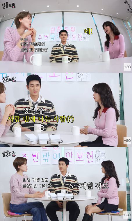 영상에서 MC 장도연은 두 사람에게 “이번 작품에서 처음 만난 게 맞냐”고 물었고, 이주빈은 “그렇다”고 답한 뒤 “함께 작품했던 배우들로부터 안보현이 성격 좋고 사람 냄새 나는 사람이라는 이야기를 많이 들었다”며 “다들 정확히 ‘사람 냄새’라는 표현을 쓰길래 얼마나 그렇길래 싶었는데, 정말 그랬다”고 칭찬했다.