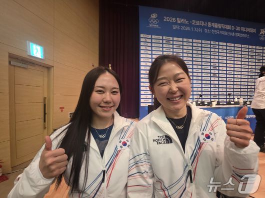 7일 밀라노 코르티나 동계 올림픽 D-30 미디어데이에 참석한 박지우와 김민선(왼쪽부터)이 취재진과 만나 인터뷰 하고 있다. ⓒ News1 |