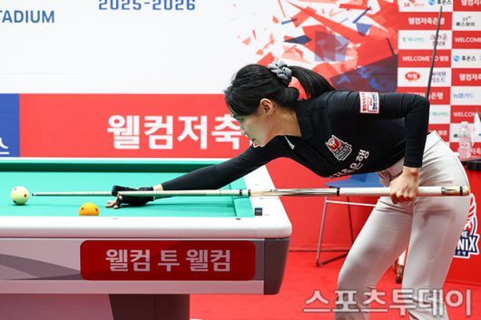 [고양(경기)=스포츠투데이 팽현준 기자] 7일 경기도 킨텍스 PBA스타디움에서 열린 웰컴저축은행 PBA 팀리그 2025-2026 5라운드 NH농협카드와 웰컴저축은행의 경기, 여자복식에 출전한 웰컴저축은행 최혜미가 샷을 하고 있다. 2026.01.07.