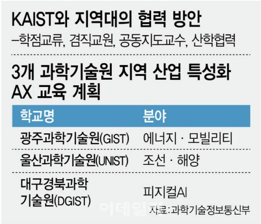 UNIST·GIST·DGIST는 이르면 연내, 늦어도 내년에 AI 단과대를 출범시키는 방안을 검토 중이다. 특히 3개 과학기술원은 지역 산업과 연계한 ‘AI 전환(AX)’ 교육과정 특성화를 내세운다. 호남권(GIST)은 에너지·모빌리티, 동남권(UNIST)은 조선·해양, 대경권(DGIST)은 피지컬 AI 등 권역별 전략산업과 AI 기술을 결합한 교육모델을 구축하겠다는 계획이다.