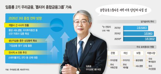 닻을 올린 우리금융그룹 임종룡 2기 체제의 핵심 과제는 '성장'이다. 은행과 증권, 보험을 아우르는 '종합금융그룹 포트폴리오 완성'이라는 성과로 연임에 성공한 만큼, 이제는 리딩금융그룹 도약을 위한 수익성을 입증해 내야 한다.