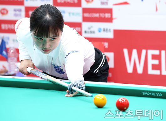 [고양(경기)=스포츠투데이 팽현준 기자] 7일 경기도 킨텍스 PBA스타디움에서 열린 웰컴저축은행 PBA 팀리그 2025-2026 5라운드 NH농협카드와 웰컴저축은행의 경기, 여자복식에 출전한 NH농협카드 황민지가 샷을 하고 있다. 2026.01.07. [스포츠투데이 팽현준 기자 sports@stoo.com]
