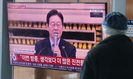 7일 한 시민이 서울역 대합실에서 이재명 대통령의 중국 상하이 현지 기자간담회 중계방송을 지켜보고 있다. 연합뉴스 |