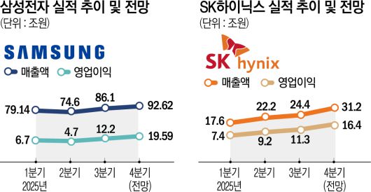 지난해 연간 기준으로 보면 삼성전자의 영업이익은 43조1048억 원, SK하이닉스는 44조5186억 원으로 합산 영업이익은 약 87조6000억 원에 달할 전망이다. 메모리 가격 상승세가 이어질 경우 연간 기준에서도 추가 상향 가능성이 열려 있다는 평가다.