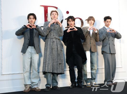 (서울=뉴스1) 권현진 기자 = 코르티스 성현(왼쪽부터)과 마틴, 건호, 주훈, 제임스가 7일 오후 서울 성동구 디올 성수에서 열린 조나단 디올 컬렉션 론칭 기념 행사에 참석해 포즈를 취하고 있다. 2026.1.7/뉴스1