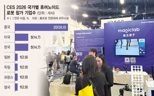 미국 로봇 전문 플랫폼·미디어 하우스봇에 따르면 CES 2026에 참가한 핵심 휴머노이드 로봇 전시 기업은 총 36곳으로, 이 가운데 중국 기업이 20여 곳으로 절반을 훌쩍 넘긴 58.8%를 기록했다. 미국과 한국은 각각 5곳에 그쳤고, 일본·유럽 등 기타 국가는 4곳으로 집계됐다. 중국 로보틱스의 영향력이 숫자로 증명되며, 올해 CES 최대 화두인 '피지컬 인공지능(AI)'의 핵심인 휴머노이드, 가사 로봇 등 로보틱스 분야에서 중국 기업의 존재감이 무시할 수 없이 커진 것으로 나타났다.