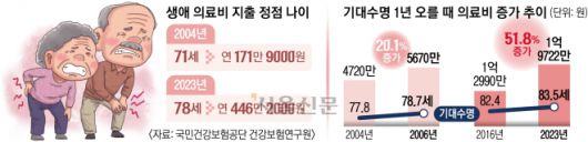 이런 변화의 배경에는 기대수명 증가가 있다. 2004년 77.8세이던 기대수명은 2023년 83.5세로 늘었다. 연구진은 “생애에서 가장 고비용 의료 서비스를 이용하는 시기가 기대수명 증가 속도보다 더 빠르게 고령기로 이동하고 있다”고 분석했다.