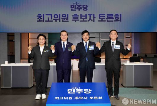 [서울=뉴스핌] 국회사진기자단 = 더불어민주당 최고위원 보궐선거에 출마한 문정복, 이건태, 이성윤, 강득구 후보(왼쪽부터)가 7일 오후 서울 마포구 상암동 JTBC에서 열린 최고위원 보궐선거 제3차 합동토론회에 앞서 기념촬영을 하고 있다. 2026.01.07 photo@newspim.com