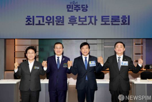 [서울=뉴스핌] 국회사진기자단 = 더불어민주당 최고위원 보궐선거에 출마한 문정복, 이건태, 이성윤, 강득구 후보(왼쪽부터)가 7일 오후 서울 마포구 상암동 JTBC에서 열린 최고위원 보궐선거 제3차 합동토론회에 앞서 기념촬영을 하고 있다. 2026.01.07 photo@newspim.com