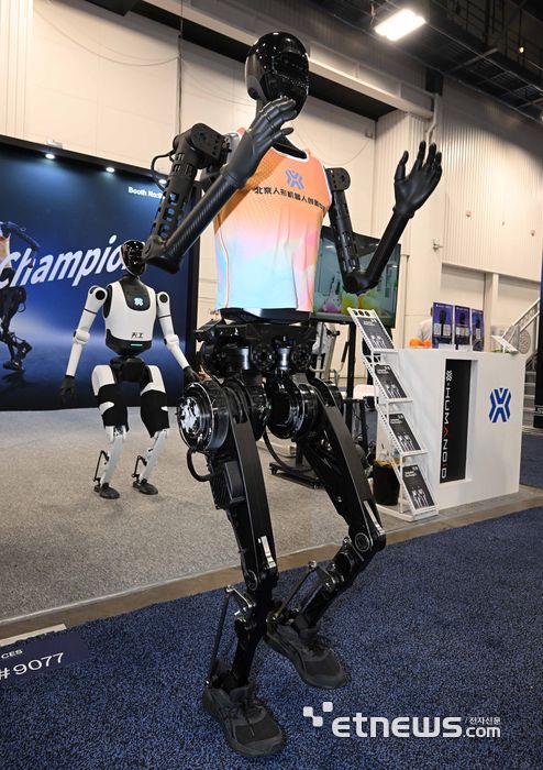 세계 최대 가전·정보기술(IT) 전시회 'CES 2026'이 개막한 6일(현지시간) 미국 네바다주 라스베이거스 컨벤션센터 노스홀에 마련된 X-휴머노이드 부스에서 중국 휴머노이드 하프마라톤 대회에서 우승한 톈궁이 달리는 모습 시연을 하고 있다. 라스베이거스=이동근기자 foto@etnews.com [Copyright © 전자신문. 무단전재-재배포금지]