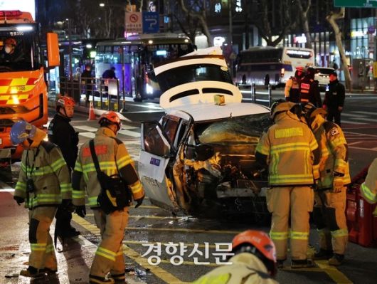 지난 2일 오후 6시7분쯤 서울 종로구 종각역 앞 도로에서 승용차 2대와 택시 1대가 잇따라 추돌하는 교통사고가 났다. 119 구조대원 등이 현장을 수습하고 있다. 정효진 기자 |