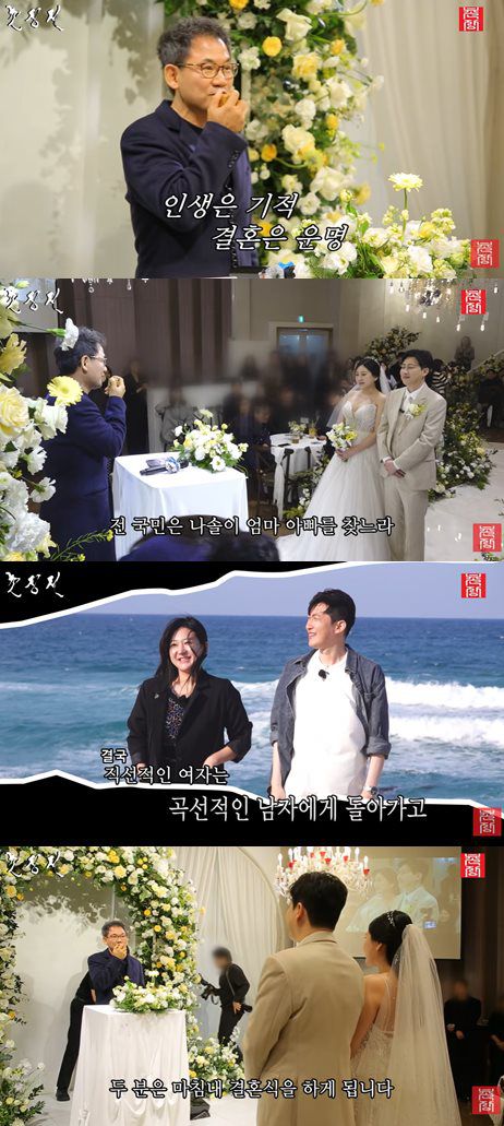 이어 “프로그램에서 ‘오늘 선택은 여자들이 하겠습니다’라고 했을 때, 첫 번째도 두 번째도 정숙은 상철을 선택하지 않았다. 세 번째에는 갈 곳이 없어 상철 옆에 서게 됐다”며 “그렇게 돌고 돌아 결국 상철 옆으로 왔고, 솔직하고 담백한 직선의 정숙은 다정하고 따뜻한 곡선의 상철에게로 갔다”고 회상했다. 그러면서 “만날 사람은 결국 만나게 되고, 인연은 누구도 막지 못한다. 두 분은 마침내 오늘 결혼식에 이르게 됐다”고 전했다.