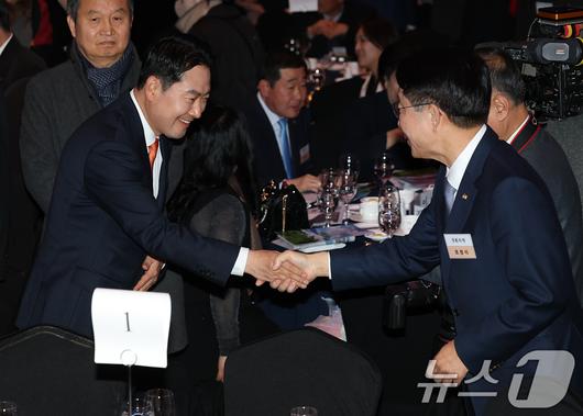 (서울=뉴스1) 오대일 기자 = 장동혁 국민의힘 대표와 조정식 대통령 정무특보가 7일 오후 서울 중구 롯데호텔에서 열린 대한민국시도민연합회장 이취임식 및 충북도민회중앙회 신년교례회에서 악수를 나누고 있다. 2026.1.7/뉴스1kkorazi@news1.krCopyright ⓒ 뉴스1. All rights reserved. 무단 전재 및 재배포, AI학습 이용 금지.