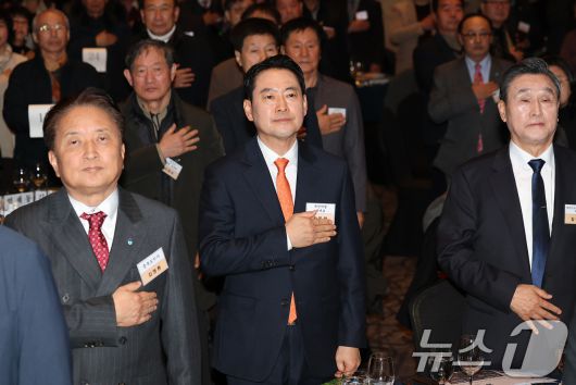 (서울=뉴스1) 오대일 기자 = 장동혁 국민의힘 대표가 7일 오후 서울 중구 롯데호텔에서 열린 대한민국시도민연합회장 이취임식 및 충북도민회중앙회 신년교례회에서 김영환 충북도지사, 김정구 신임 회장 등 참석자들과 국기에 경례하고 있다. 2026.1.7/뉴스1