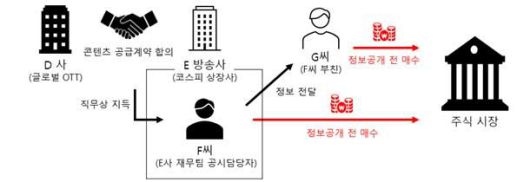증선위 조사 결과에 따르면, 상장 방송사 E사의 재무팀 공시담당자였던 F씨는 자사가 글로벌 온라인동영상서비스(OTT) 기업 D사와 콘텐츠 공급 관련 전략적 파트너십을 체결한다는 호재성 정보를 직무상 먼저 입수했다.