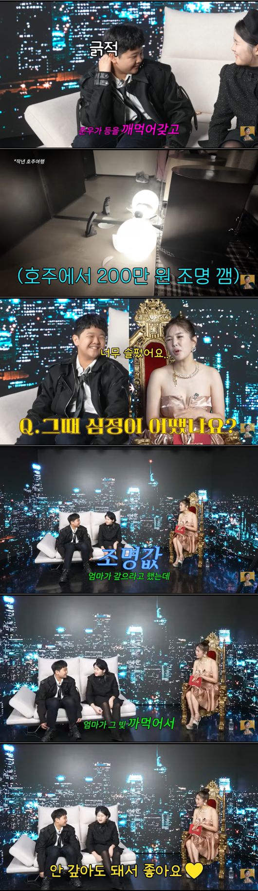 장영란이 당시 심정을 묻자, 아들 준우는 "너무 슬펐다"고 회상하면서도 이내 반전 있는 속마음을 공개했다. 준우는 "원래 엄마가 (조명값을) 갚으라고 했었는데, 엄마가 그 빚을 까먹었다. 그래서 안 갚아도 돼서 너무 좋다"라고 천진난만하게 고백해 현장을 웃음바다로 만들었다.