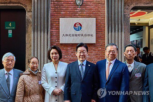 (상하이=연합뉴스) 한상균 기자 = 이재명 대통령과 김혜경 여사가 7일 중국 상하이 대한민국 임시정부 청사에서 열린 청사 건립 100주년 기념식을 마친 뒤 독립유공자 후손들과 기념촬영을 하고 있다. 2026.1.7 [공동취재 제공. 재판매 및 DB 금지]