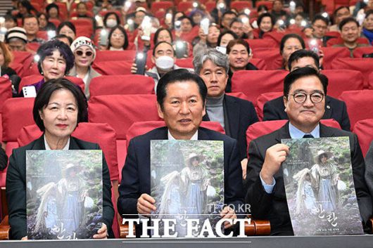 [더팩트ㅣ국회=남용희 기자] 추미애 국회 법제사법위원장과 정청래 더불어민주당 대표, 우원식 국회의장(앞줄 왼쪽부터)이 7일 오후 서울 여의도 국회 의원회관 대회의실에서 열린 영화 '한란' 상영회에 참석해 기념촬영을 하고 있다.