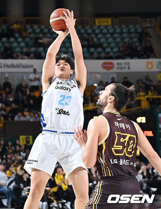 [OSEN=창원, 이석우 기자] 7일 창원 체육관에서 2025-2026 LG전자 프로농구 창원 LG와 서울 삼성의 경기가 열렸다. 삼성전 6연승을 질주하고 있는 LG가 이번 맞대결에서도 상승세를 이어갈 수 있을지 관심이 모아진다. 서울 삼성 이규태가 창원 LG 아셈 마레이의 마크를 피해 골밑슛을 시도하고 있다. 2026.01.07 / foto0307@osen.co.kr