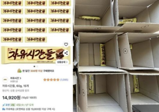 최근 사회관계망서비스(SNS)에는 ‘지인이 받은 자유시간 15개+15개 상자’라는 제목의 글이 게재됐다. 해당 글에는 인증 사진도 담겨있었는데, 해당 사진에는 동일한 60g 짜리 초코바 제품이 중형 박스에 각각 15개의 박스에 1개씩 담겨 있는 모습이다.