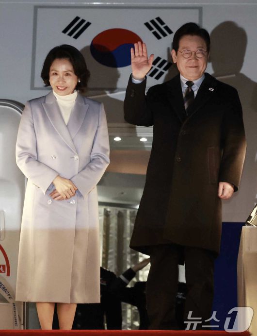 (상하이(중국)=뉴스1) 허경 기자 = 중국 국빈방문 일정을 마치고 귀국하는 이재명 대통령과 김혜경 여사가 7일 상하이 푸동 공항에서 공군1호기에 올라 인사하고 있다. 2026.1.7/뉴스12expulsion@news1.krCopyright ⓒ 뉴스1. All rights reserved. 무단 전재 및 재배포, AI학습 이용 금지.