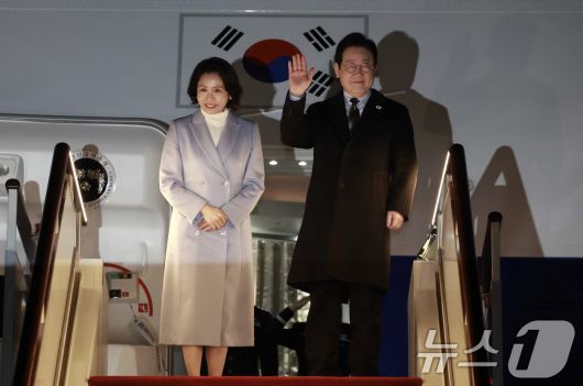 (상하이(중국)=뉴스1) 허경 기자 = 중국 국빈방문 일정을 마치고 귀국하는 이재명 대통령과 김혜경 여사가 7일 상하이 푸동 공항에서 공군1호기에 올라 인사하고 있다. 2026.1.7/뉴스12expulsion@news1.krCopyright ⓒ 뉴스1. All rights reserved. 무단 전재 및 재배포, AI학습 이용 금지.