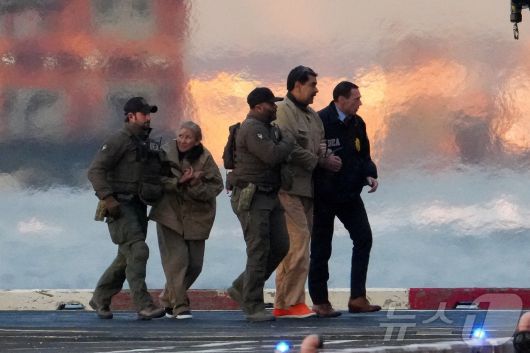 니콜라스 마두로 베네수엘라 대통령과 부인 실리아 플로레스가 5일(현지시간) 미국 뉴욕 맨해튼에 도착한 헬기에서 내려 마약단속국(DEA) 요원들에 의해 연방 법원으로 호송되고 있다. ⓒ 로이터=뉴스1 |