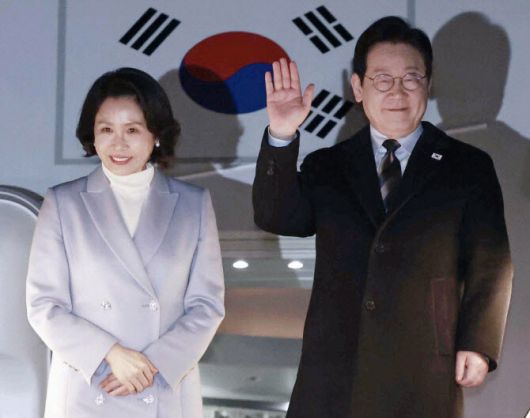 중국 방문 공식일정을 마친 이재명 대통령과 김혜경 여사가 7일 상하이 푸둥 공항 한국행 공군 1호기에서 환송객에게 인사하고 있다.(사진=연합뉴스) |