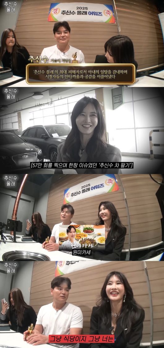 제작진은 ‘따봉’ 트로피와 함께 “위 귀하는 ‘추신수 몰래’ 콘텐츠의 최대 피해자로서 큰 공로가 있어서 이에 표창한다”라고 전했다. 이에 추신수는 “정말 맞아요. 진짜 자동차 팔려 나갈 때 진짜 (치명상이었다)”라고 수긍했다.