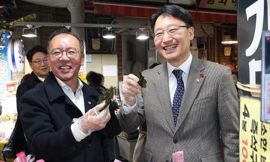 임광현 국세청장(오른쪽)이 지난 6일 이충환 전국상인연합회장과 수원시 팔달구 못골시장을 돌아보고 있다. 국세청 제공 |