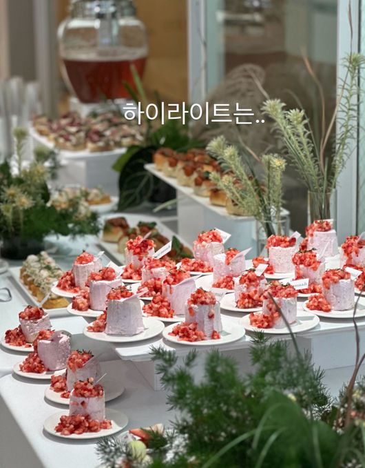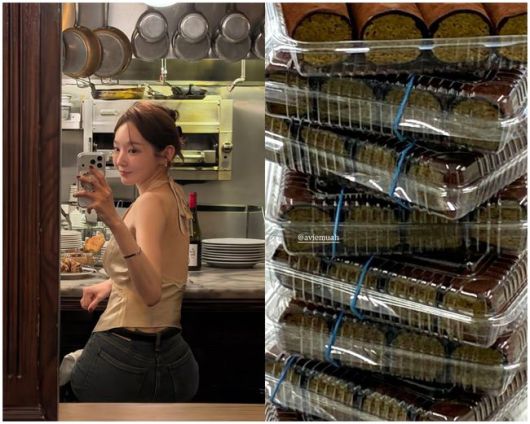 강민경은 "시무식 하이라이트는 바로 두쫀쿠 아니 두쫀김"이라며 다양한 먹을거리를 공개했다. 사진 속 시무식 음식들은 갓 구운 마들렌에 설탕을 입힌 과자, 오묘한 색감이 군침을 돌게 하는 딸기 케이크 그리고 요새 없어서 못 판다는 두바이 쫀득 쿠키에 피스타치오 카다이프를 듬뿍 넣어 마시멜로우 초코로 김밥처럼 감싼 디저트를 상자 째로 쌓아두었다.