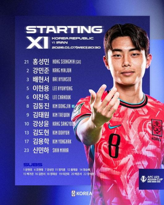 [서울=뉴스핌] 7일에 펼쳐지는 2026 AFC U-23 아시안컵 조별리그 C조 이란전 대한민국 축구대표팀 선발 라인업. [사진 = 대한축구협회] 2026.01.07 wcn05002@newspim.com |
