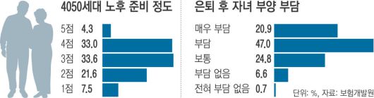 40·50세대들의 67.9%는 은퇴 후 자녀 부양에 부담을 느끼고 있다고 말했다. 응답자들이 예상한 은퇴 이후 자녀 교육비용은 평균 4629만원가량이었으며, 자녀들의 결혼 비용은 평균 1억3626만원이었다.