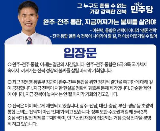 이원택 의원은 "답은 명확하다. 완주-전주 통합으로 인구와 산업이 모이는 중추도시를 세워야 한다"며 "통합을 미루는 것은 전북의 미래를 포기하는 것과 같다"고 주장했다.