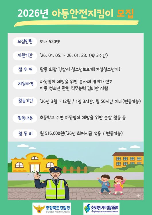 충북경찰청은 오는 23일까지 2026년 아동안전지킴이를 모집한다고 7일 밝혔다.
