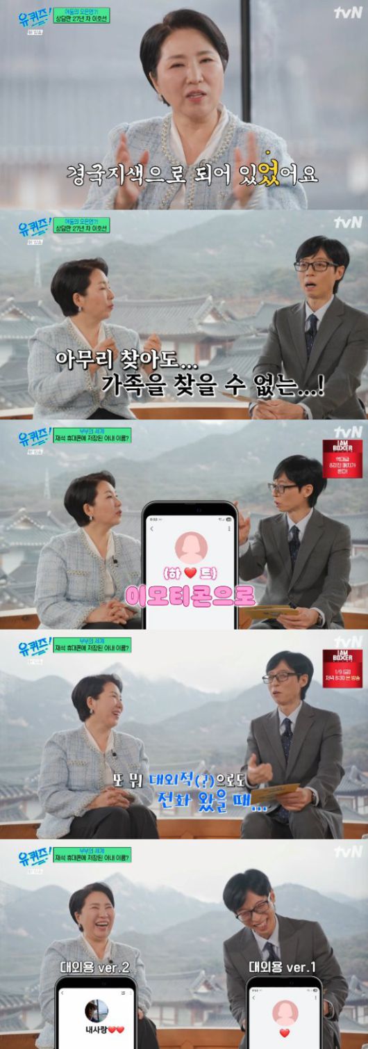 이호선은 유재석에게 "아내분을 어떻게 저장해 놓으셨냐"고 했고, 유재석은 "하트 이모티콘으로 해놨다. 그렇게 해놓으면 대외적으로도 전화 왔을 때..."라면서 웃음을 참지 못했다.