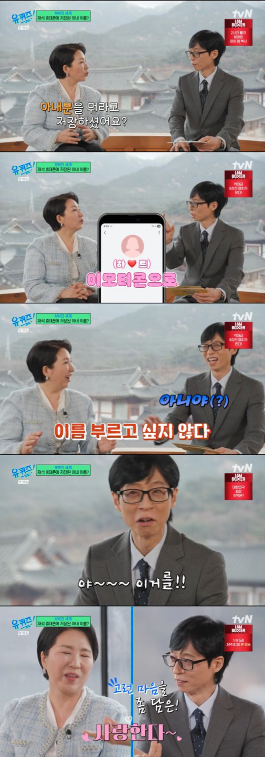 분위기를 이어 이호선은 유재석에게 “아내를 뭐라고 저장하셨어요?”라고 물었고, 유재석은 “저는 그냥 이모티콘으로 해놨어요. 하트 이모티콘으로”라고 답하며 다정한 면모를 보였다.